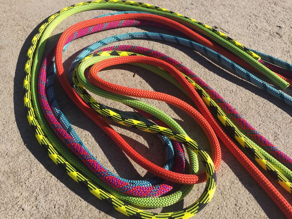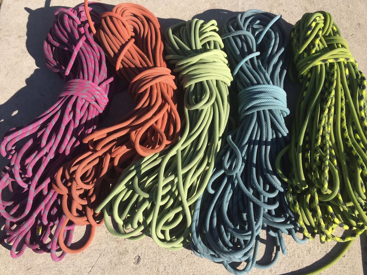 The lineup of midsize climbing ropes tested, from left to right: Sterling Evolution Helix, Petzl Arial, Mammut Infinity, BlueWater Wave, Maxim Pinnacle Yellow Jacket.
