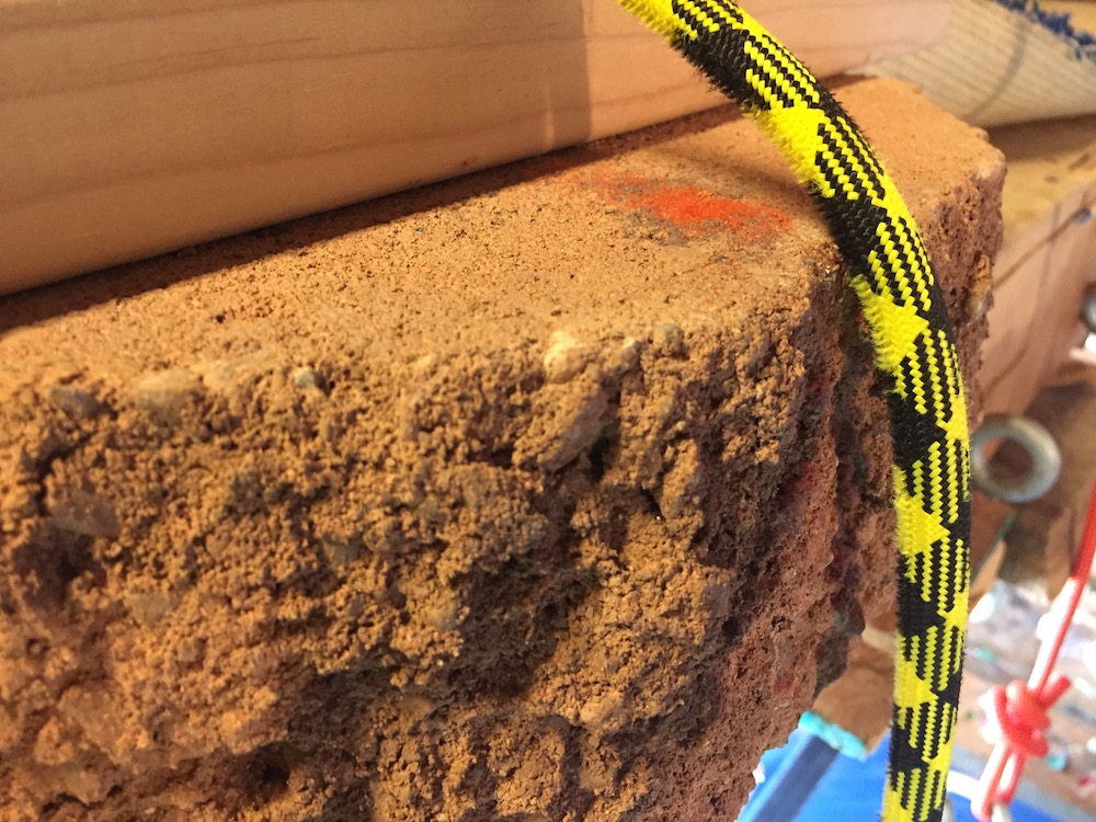The sharp edge test uses a piece of sandstone with the rope weighted with a 55-pound haul bag.