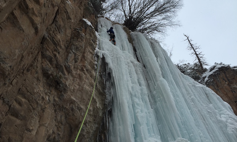 The dry treatment of the Mammut Infinity being put to the test on an ice climb in Rifle Mountain Park, Colorado.