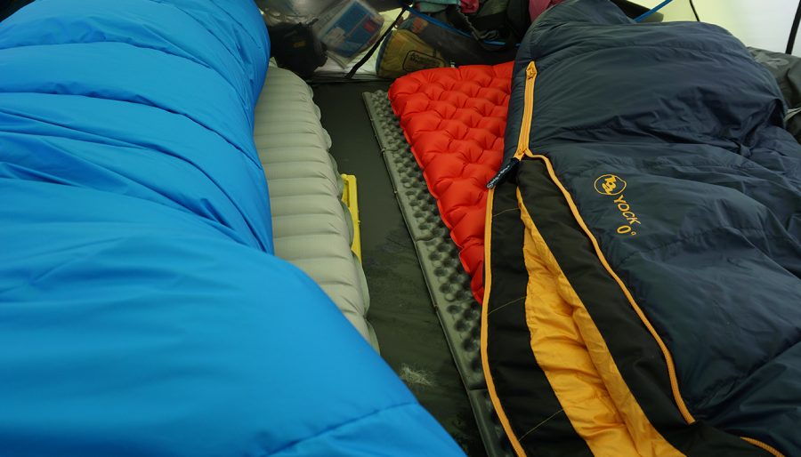 Closed-cell foam sleeping pads are layered underneath the Therm-a-Rest NeoAir XTherm and the Sea to Summit Comfort Plus while camping on top of snow on the Pika Glacier in Alaska.