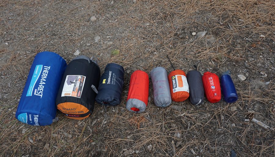 Our insulated sleeping pad test models, packed for size comparison: (L to R) Therm-a-Rest Luxury Map, Nemo Nomad Camping Mattress, Therm-a-Rest ProLite Apex, Sea to Summit Comfort Plus, Sea to Summit Women’s Etherlight, Klymit Static V, Therm-a-Rest NeoAir XTherm, Big Agnes AXL Air.