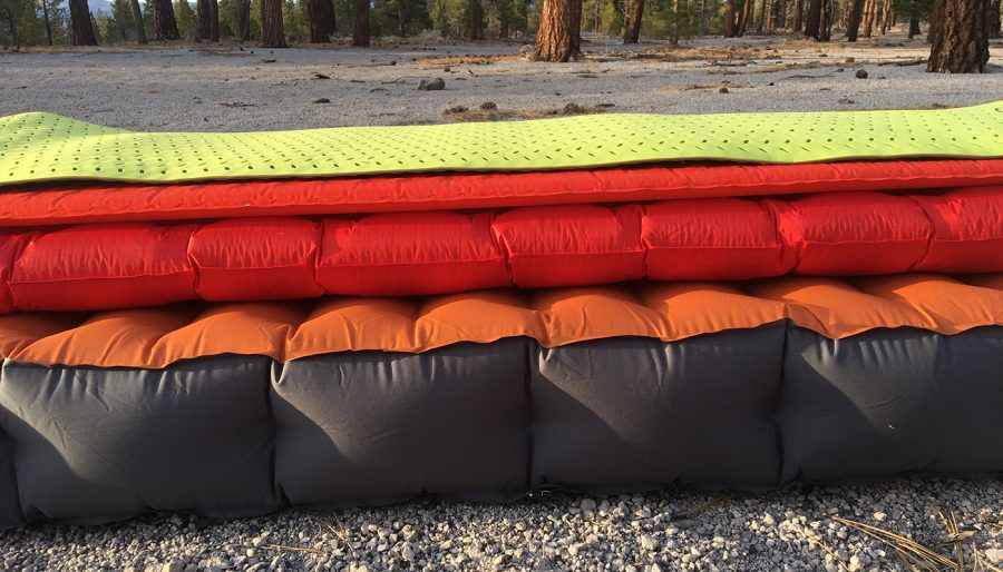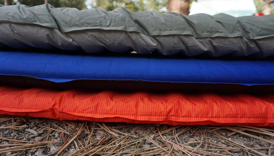 Here we can see different styles and constructions of sleeping pads: On the bottom is the Nemo Nomad Camping Mattress, which is a large car-camping bed. Next is the air construction Big Agnes AXL. Above that is the self-inflating Therm-a-Rest ProLite, and on top is the closed-cell foam Big Agnes Third Degree.