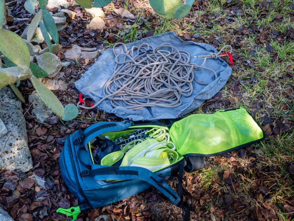 The included 36” square rope tarp was on the small side; I could manage a 35m rope but it was troublesome to stack a full-length cord. The tarp had a circumferential drawcord that worked well to pack or move for a 35m rope between adjacent routes. I preferred bringing a rope bag when using full-length ropes but still packed the Mammut tarp for shoeing up or racking gear.