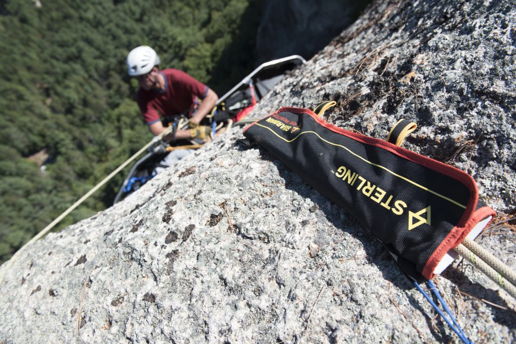 Limiting abrasion should also be a major concern at the cliff. The rock, carabiners and belay devices can all contribute to abrasion and sheath damage. The rougher, sharper and heavier loads the rope endures, the faster the sheath will be compromised; progressively getting rougher, fuzzier and thinner. Eventually, the core can protrude, signaling the end of the life of at least that section of cord. Proper rope management avoids sources of abrasion as much as possible and can include using packs, jackets and such to pad the rope from sharp or excessively rough surfaces. Specialty products like the Sterling SafeGuard rope protector can be extremely useful for protecting the rope from aggressive edges and abrasion from other ropes and gear. Proper lowering and rappelling speed is also important to safeguard the rope against friction burns and ropes should never run against each other or through slings.