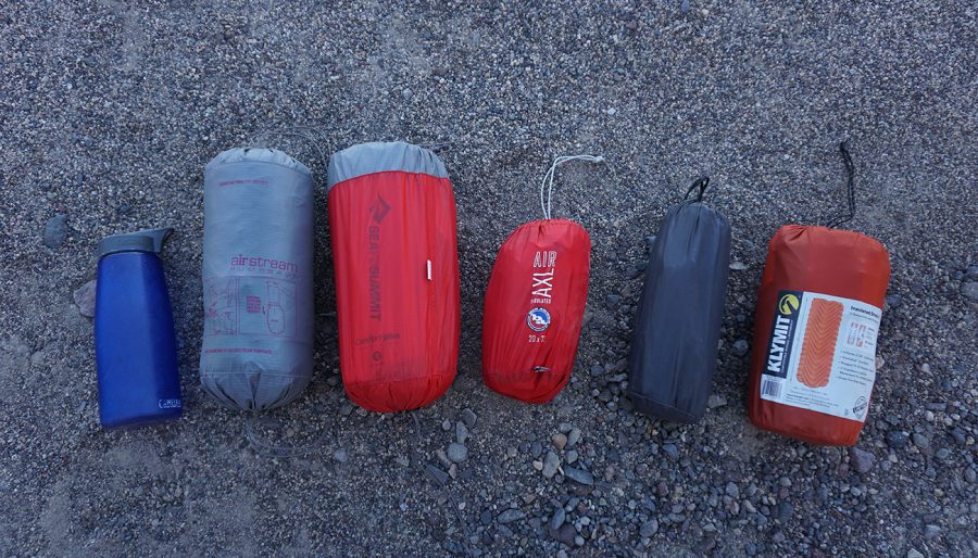 A closer version of the small and packable insulated sleeping pads: (L to R) Sea to Summit Women’s Etherlight, Sea to Summit Comfort Plus, Big Agnes Insulated AXL Air, Therm-a-Rest NeoAir XTherm, and Klymit Static V Insulated.