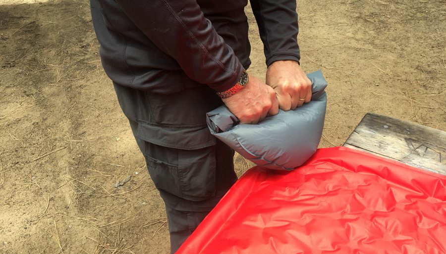 Pumping up the Sea to Summit Comfort Plus with the included stuff sack. The Women’s Etherlight uses the same, easy-to-use system.