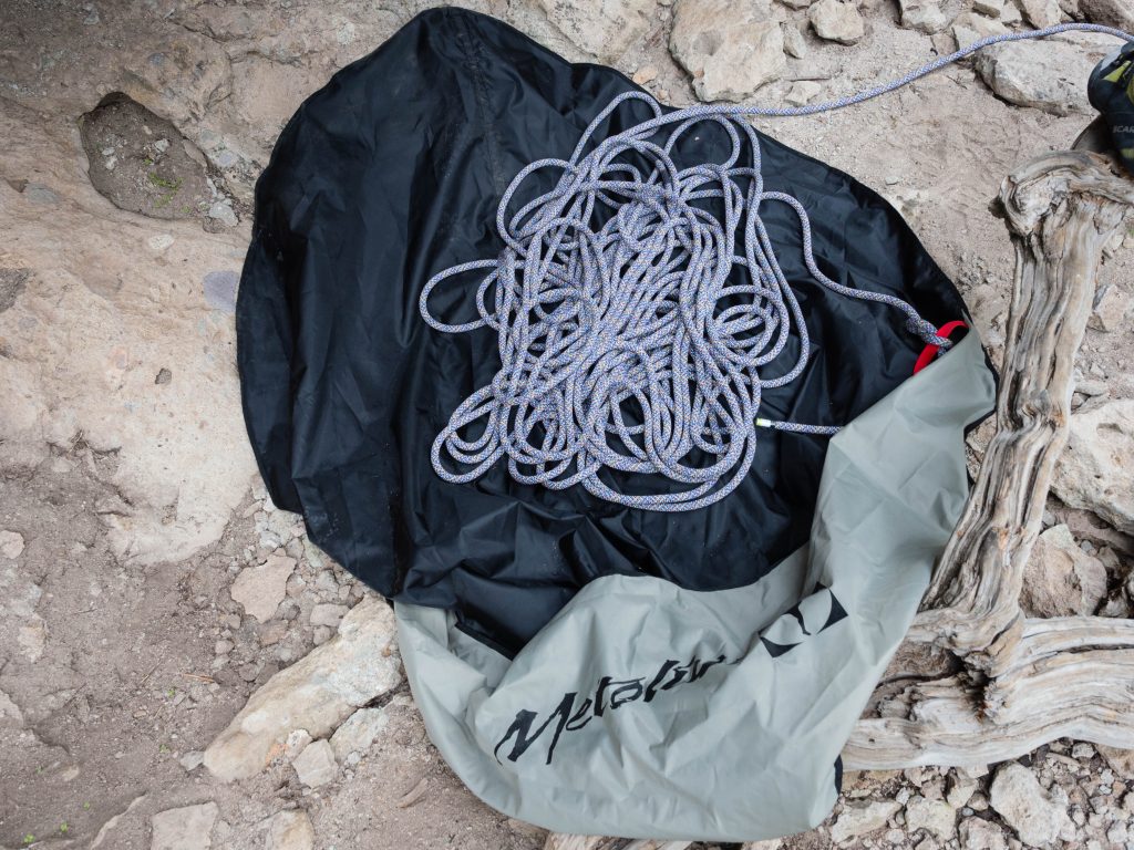 Proper handling then continues at the cliff or gym. Climbers should make every attempt to keep the rope clean. Using a rope tarp keeps dirt and other debris from contaminating yarns. Crystals or sand present in some dirt can work their way into the core and damage the load bearing yarns. Any dirt can render the rope stiff and difficult to handle. Rope tarps are an easy way to eliminate the major source of contamination along with avoiding stepping onto the rope.